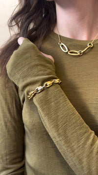 Bold and luminous, this Lucia wide chain bracelet embodies the perfect harmony of strength and elegance. Expertly handcrafted in Italy, it features interlocking links of 18K yellow and white gold adorned with shimmering diamonds for a touch of refined brilliance. Sculptural yet fluid, this design captures the essence of modern luxury—sophisticated, confident, and effortlessly radiant.