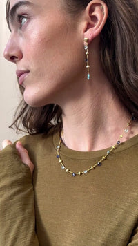 Vibrant and graceful, these Paradise drop earrings feature a playful combination of iolite and topaz set in luminous 18K yellow gold. Handcrafted in Italy, their cascading design allows each gemstone to catch the light beautifully, creating a sparkling, dynamic effect. With their cheerful colors and refined artistry, these earrings bring a joyful elegance to any outfit.
