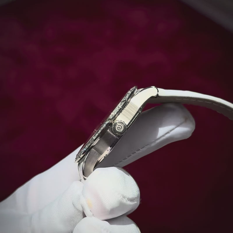 Bold and refined, this 42mm timepiece features a silver dial framed in 18K white gold, accented with a diamond-set bezel for a striking finish. Its automatic movement powers the small seconds, blending precision with commanding style. Paired with a white leather strap and deployant clasp, it is designed for men who appreciate luxury with a modern edge. Water-resistant to 50 meters. Presented with a box, papers, and a 2-year The Solist warranty.
