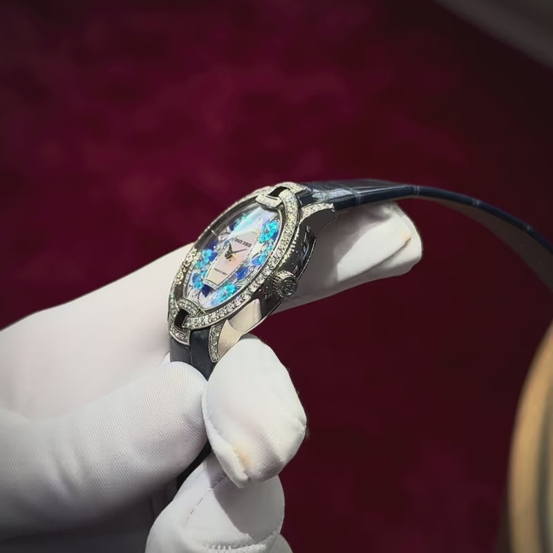 A true work of art, this 36mm timepiece showcases a mother-of-pearl dial adorned with sculpted Grand Feu enamel flowers, encased in 18K white gold and highlighted by a diamond-set bezel. Its automatic movement ensures precise performance, while the blue leather strap and deployant clasp offer both elegance and comfort. Designed for women who cherish sophisticated craftsmanship intertwined with playful artistry. Water-resistant to 30 meters. Presented with a box, papers, and a 2-year The Solist warranty.