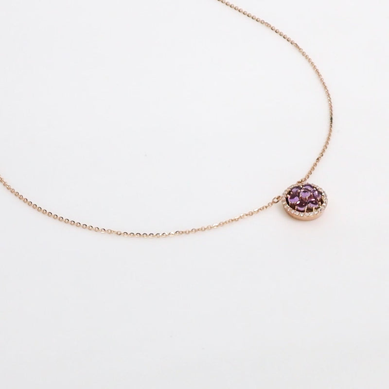 Subtle yet enchanting, this necklace pairs the regal hue of amethyst with the delicate sparkle of diamonds for a look that is both refined and timeless. Set in warm 18KT rose gold, the 12mm pendant is gracefully suspended from a 16-inch chain, offering a perfect balance of elegance and everyday wearability. With Italian craftsmanship at its core, it’s a versatile piece that adds a touch of luxury to any moment.