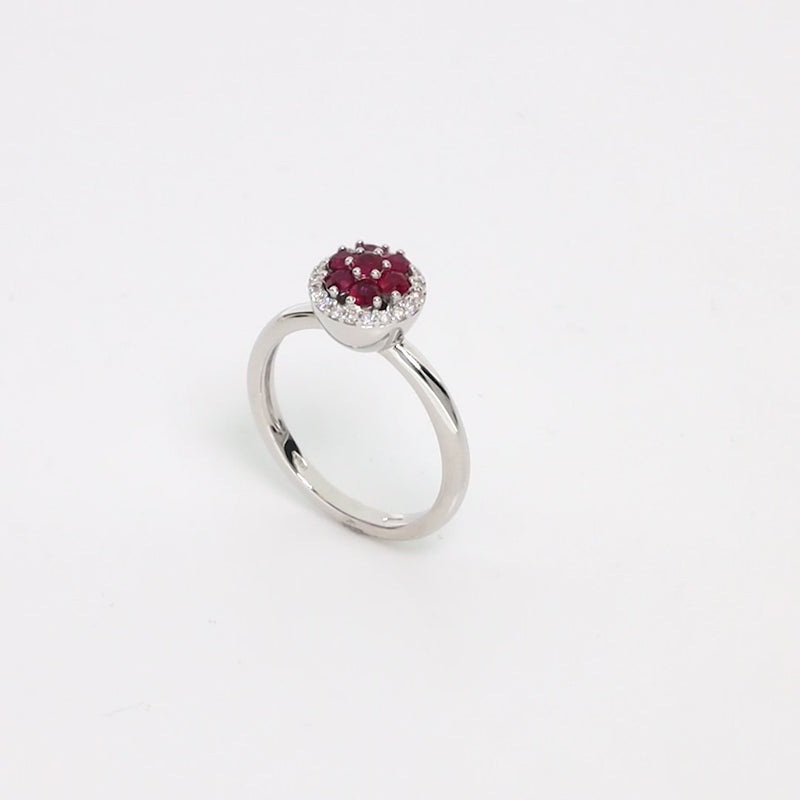 Timeless and alluring, this 18K white gold ring highlights the fiery elegance of ruby, framed by the sparkle of 0.12ctw G Si diamonds. Measuring 9.5mm at the top and weighing 5.06 grams, this size 8 piece carries the 750 stamp and Italian maker’s marks, ensuring both authenticity and fine craftsmanship. A refined balance of passion and brilliance, it’s the perfect ring for those who appreciate understated luxury with a vibrant touch.