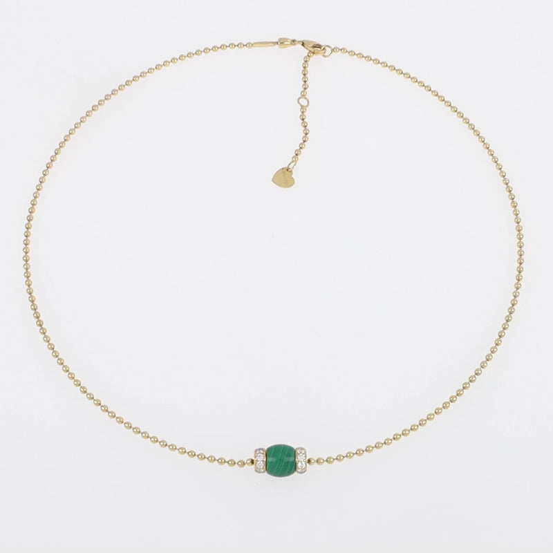 Bold yet refined, this 18K yellow gold pendant necklace pairs the rich, natural beauty of malachite with the brilliance of 0.70ctw diamonds for a luminous contrast. Adjustable from 16.5" to 18.5", it bears the 750 hallmark and Italian maker’s marks, ensuring both authenticity and exceptional craftsmanship. With its elegant balance of gemstone allure and golden warmth, this piece is a versatile statement that transitions seamlessly from day to evening.