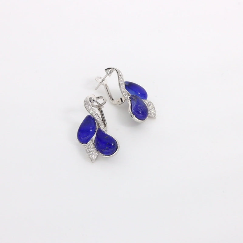 Striking and sophisticated, these earrings showcase deep blue lapis lazuli paired with luminous rock crystal, set in gleaming 18K white gold. Accented with 0.46 carats of sparkling G Si diamonds, they create a bold yet elegant statement. Perfect for adding a touch of luxury and color to both day and evening looks.