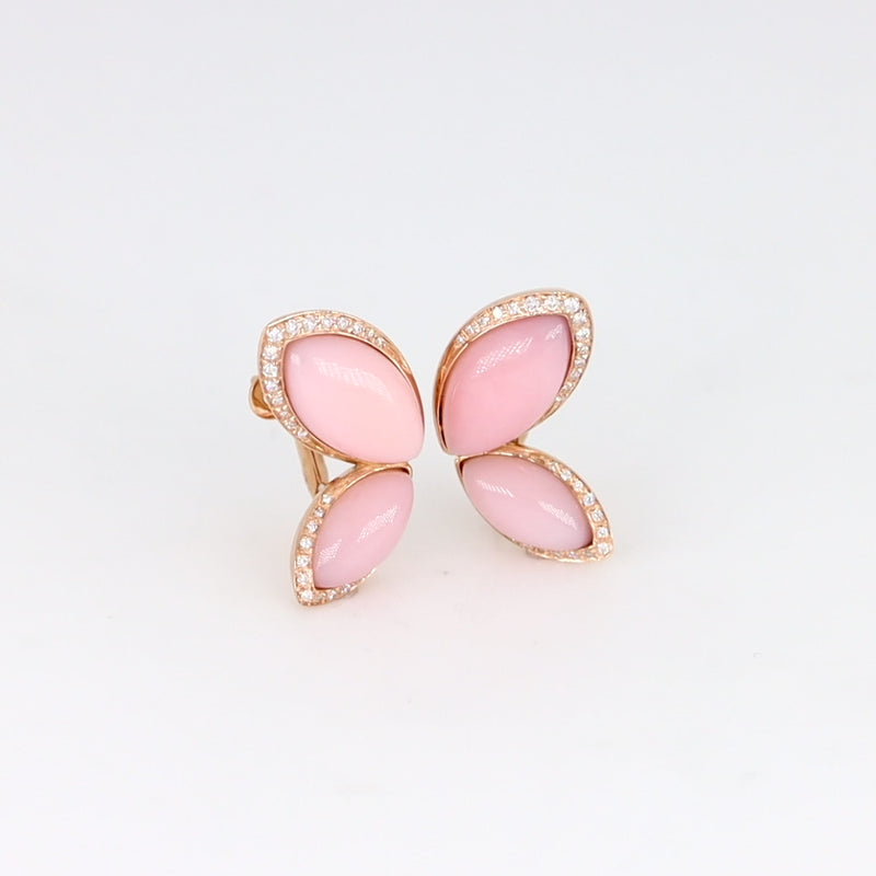 Soft and enchanting, these earrings feature gentle pink opals set in radiant 18K yellow gold, accented with 0.25 carats of sparkling diamonds. Their elongated silhouette captures the light beautifully, offering a delicate yet striking touch of elegance. Perfect for adding a subtle pop of color and refined shimmer to any ensemble.