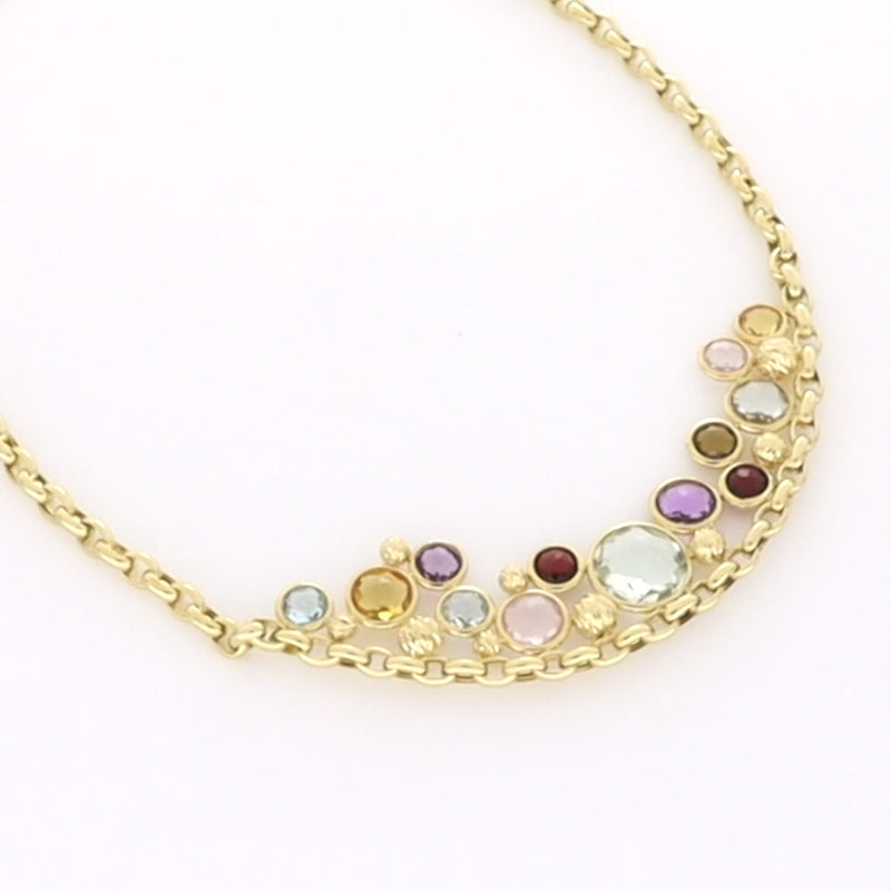 Bursting with color and charm, this stunning necklace features citrine, quartz, garnet, and amethyst gemstones elegantly set in glowing 18K yellow gold. Measuring 16.5 inches long and 20mm wide, it radiates warmth and sophistication—a joyful statement piece that brightens any look with its vibrant sparkle.