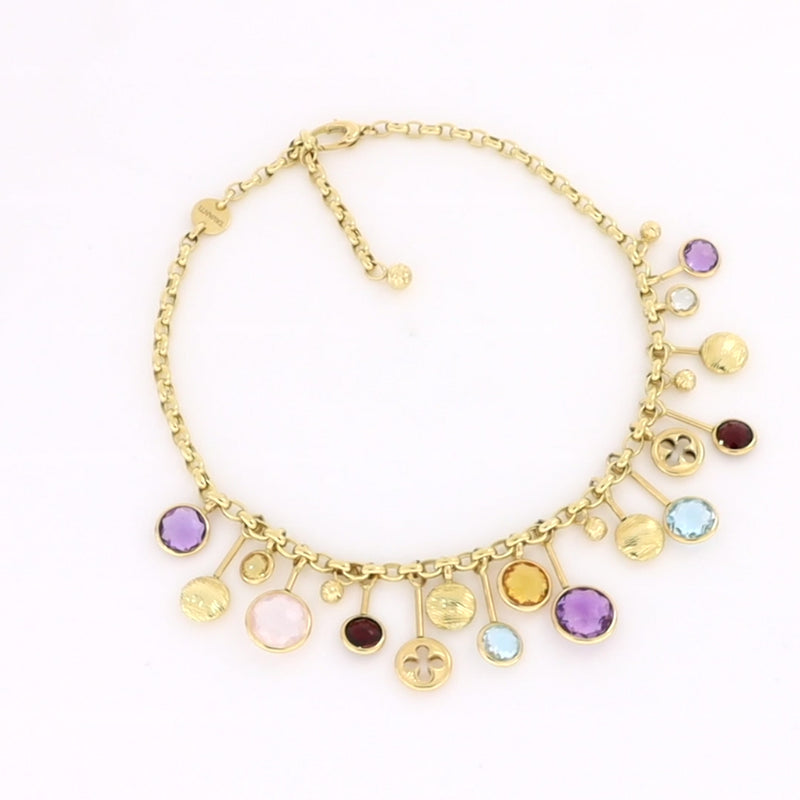 Radiating elegance and vibrant color, this exquisite necklace combines the rich warmth of 18K yellow gold with the natural beauty of garnet, citrine, quartz, and amethyst. Expertly crafted by Tavanti, each semiprecious stone is thoughtfully arranged to create a harmonious, eye-catching design that elevates any ensemble. Measuring 15 inches in length, it sits gracefully along the neckline, while Italian maker’s marks and a 750 gold stamp assure authenticity and enduring quality. Perfect for adding a touch of sophistication to both everyday looks and special occasions.